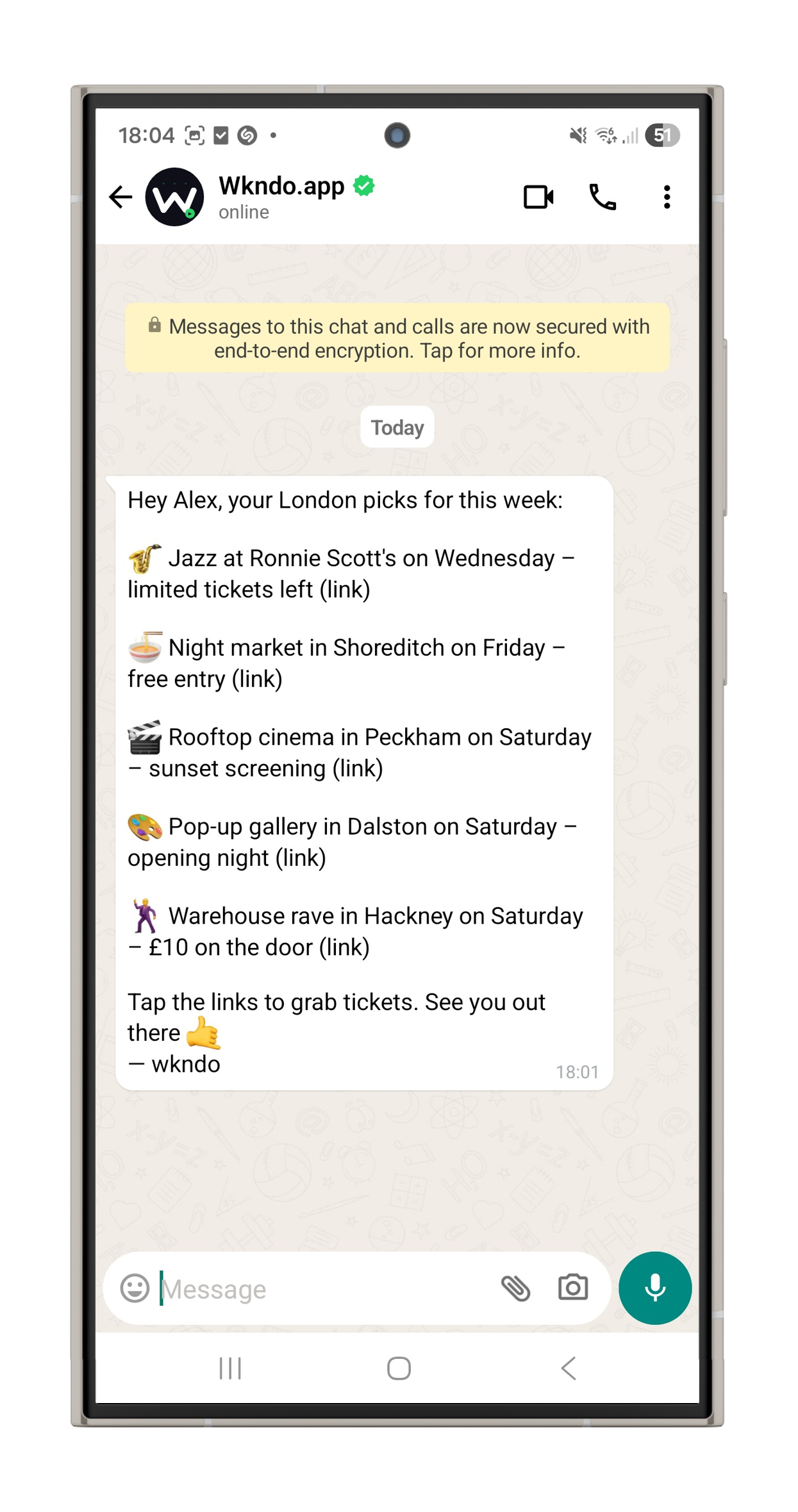 No apps. No scrolling. Just a message every Friday morning with the events worth your time, based on your preferences and curated by AI, filtered for you.